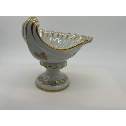 BOWL Fluted Pedestal Gold Trimmed small flower accents - Vintage Rare Porcelain Oyster Candy bowl dish