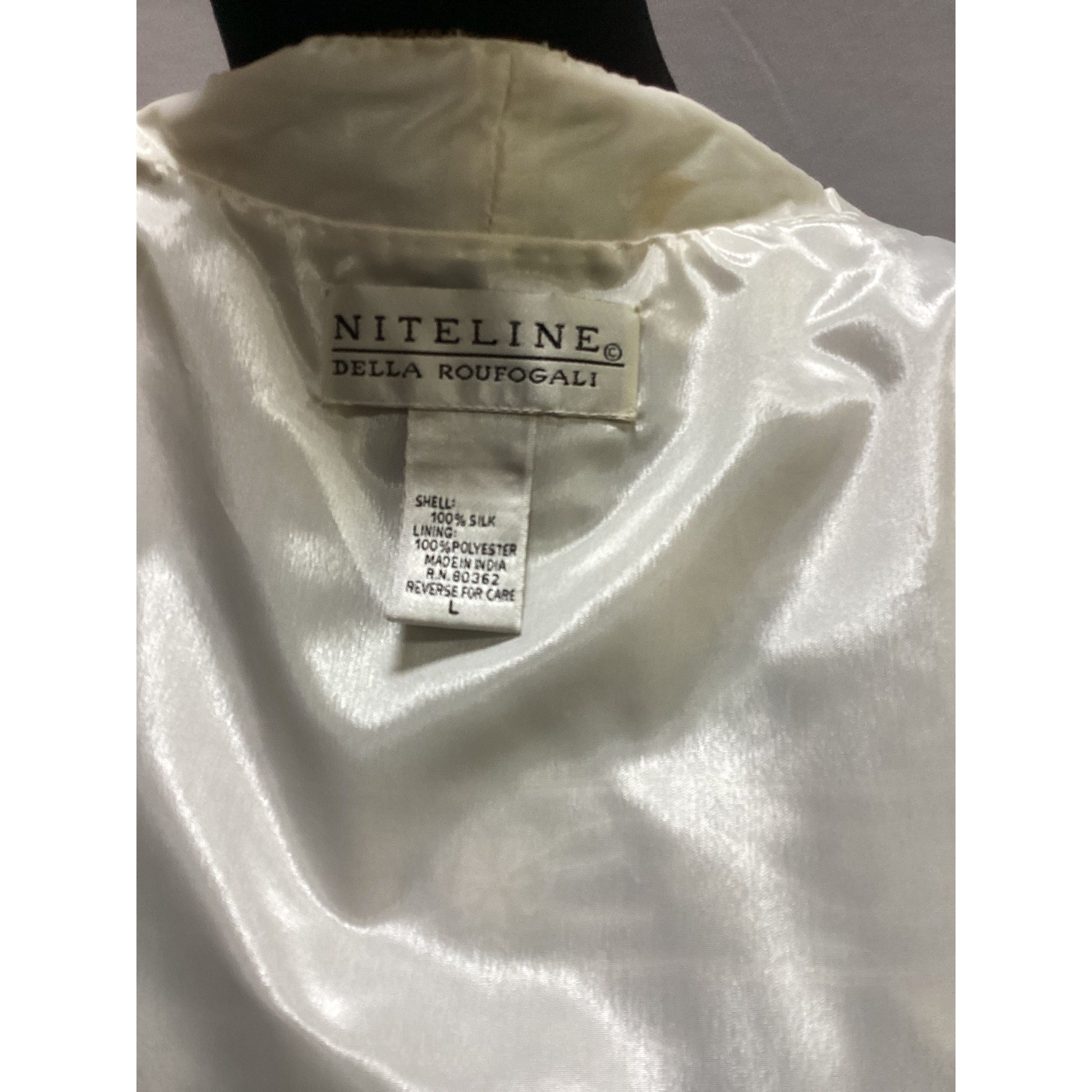 Elevate Your Style with Elegance and Sophistication! Introducing the Niteline Della Roufogali 100% Silk Beaded Jacket in a stunning size large, draped in a beautiful and timeless beige hue.
