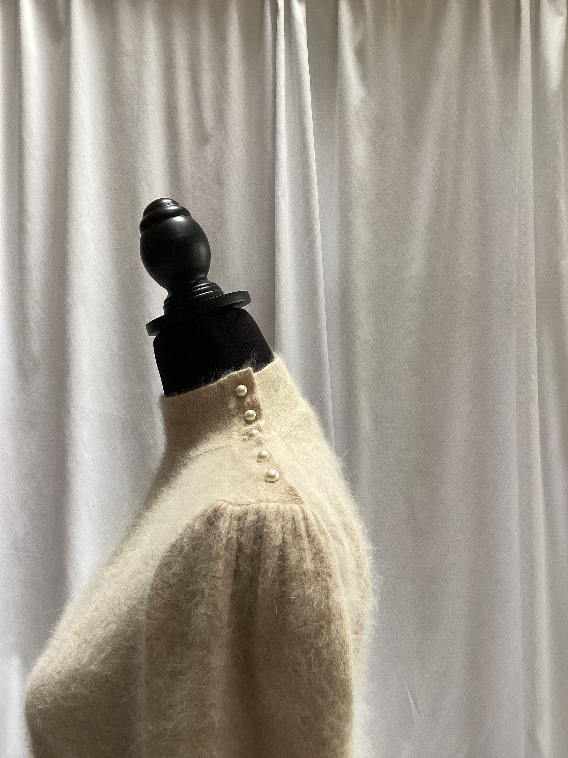 Made from a sumptuous blend of lambswool and angora, this sweater offers unparalleled softness and warmth. The beige hue adds versatility, allowing you to effortlessly pair it with various outfits for any occasion.