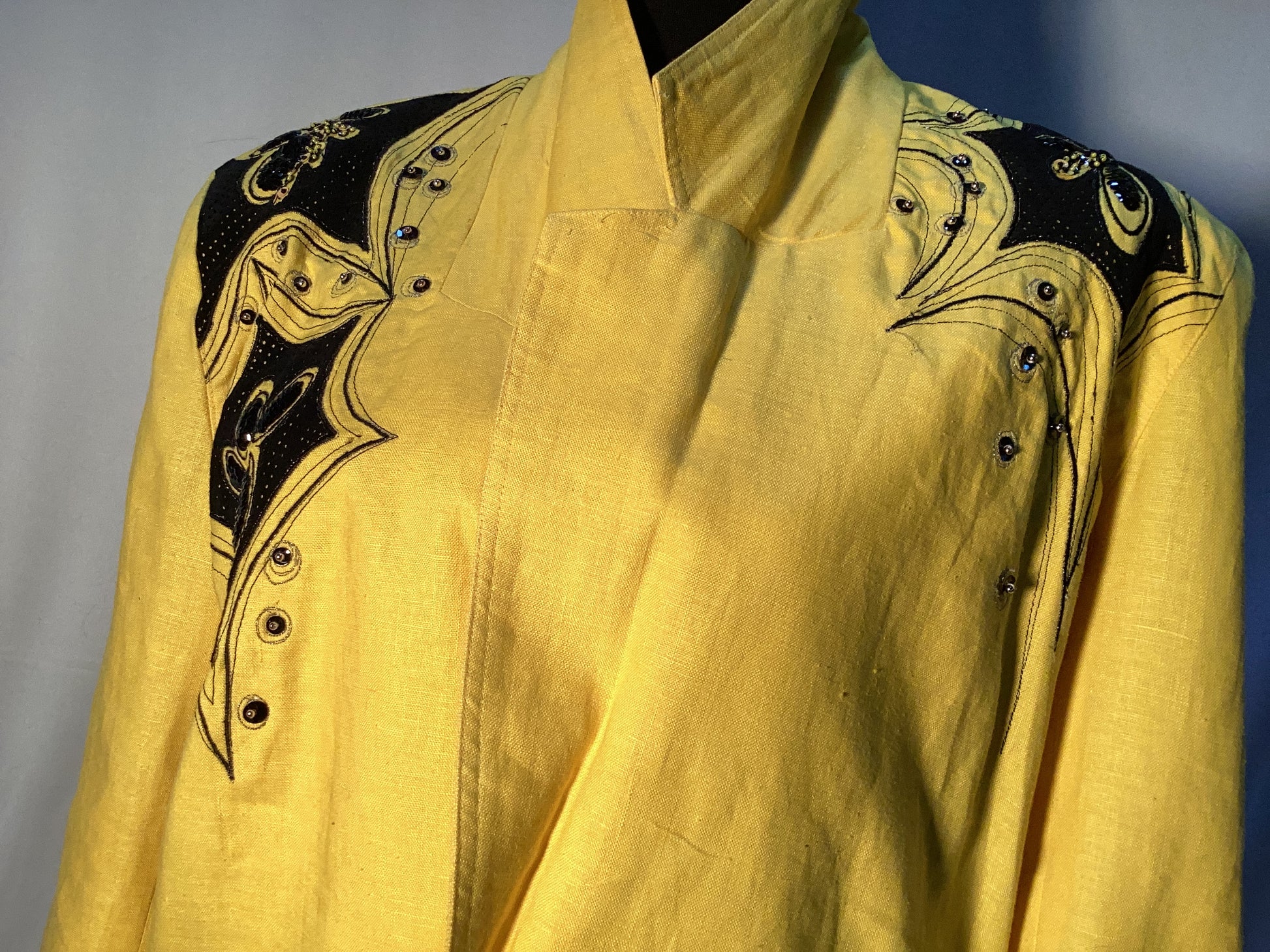 - Unique Design: The striking yellow linen paired with sequin and leather appliqué showcases artistic flair.