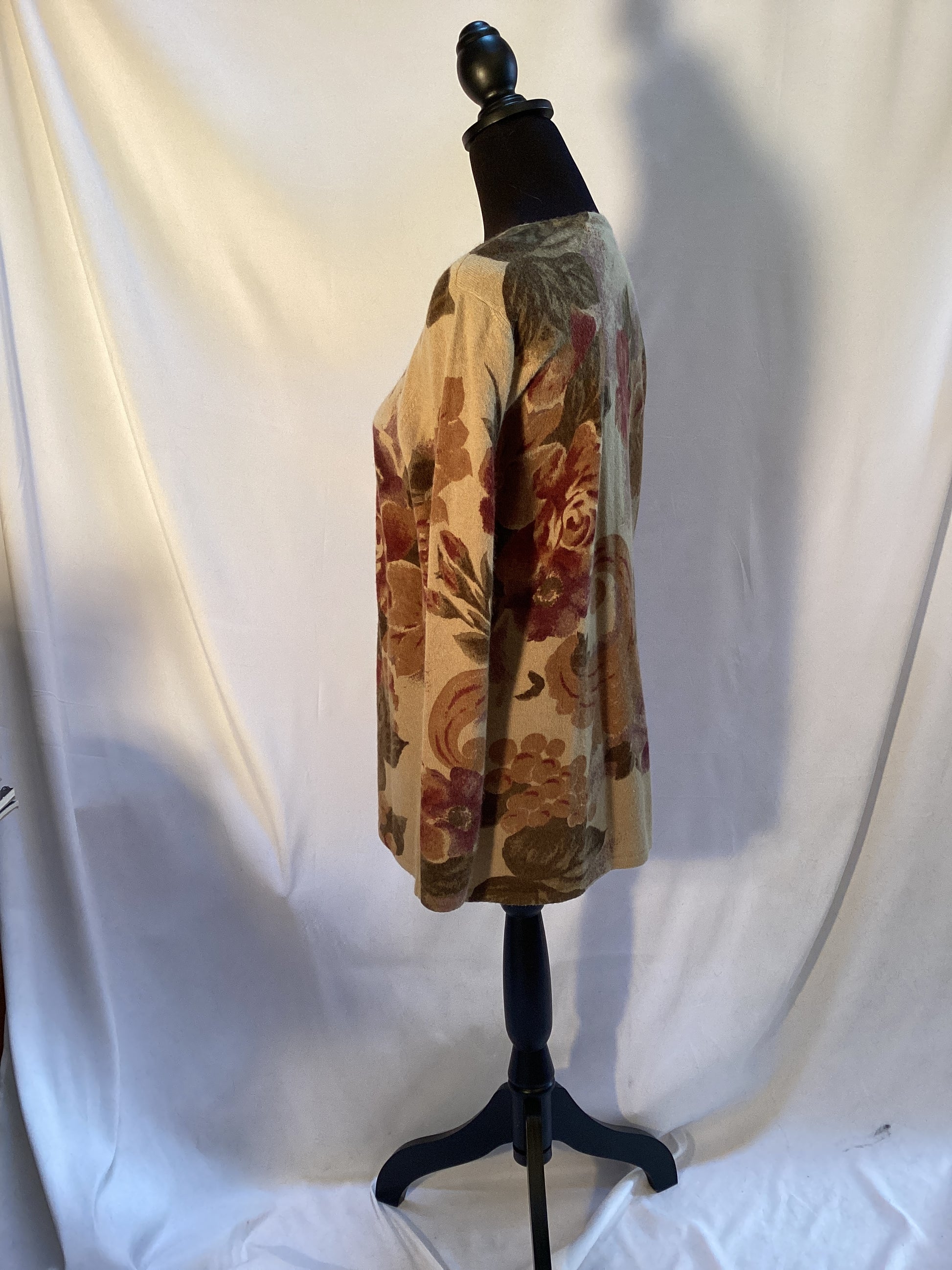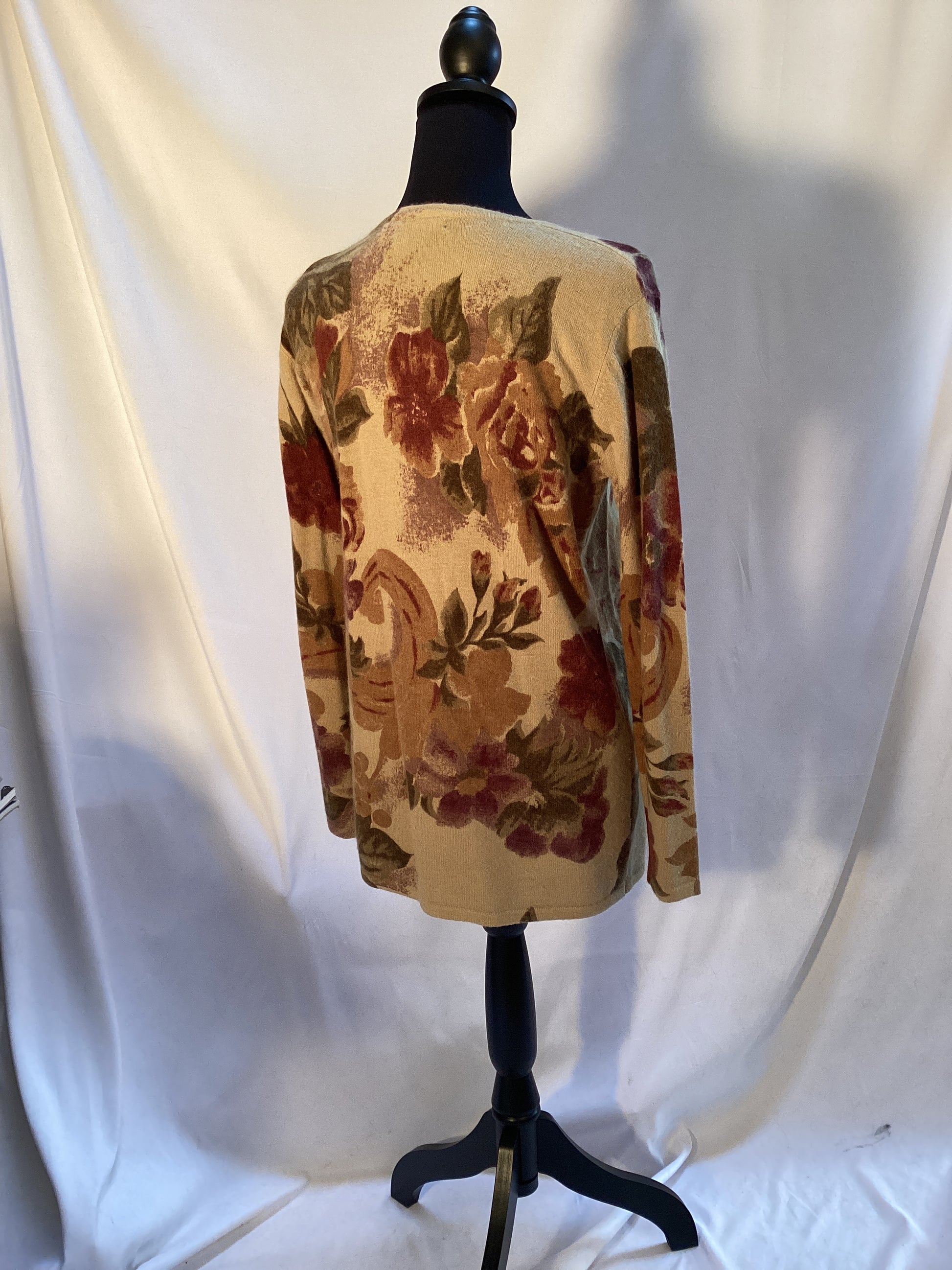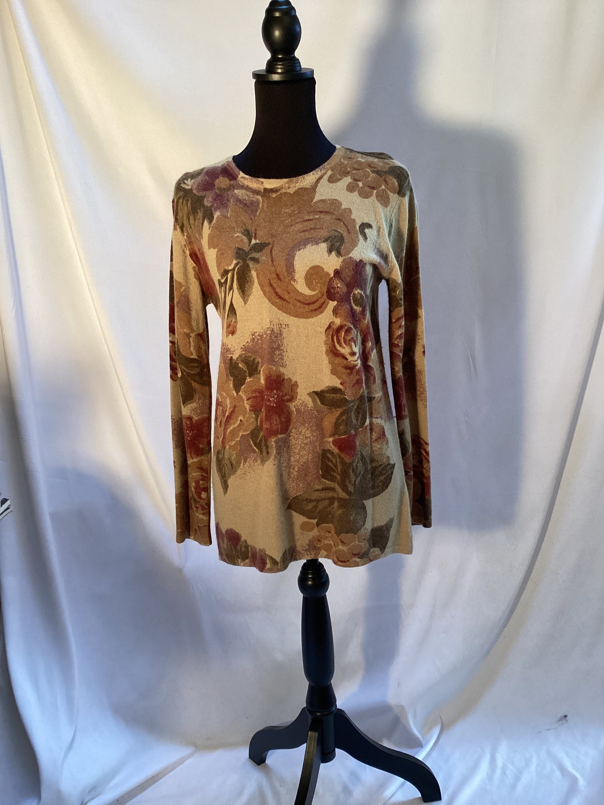 Soft brown print pull over Sweater by Nina Leonard size small, lambs wool, angora, nylon blend