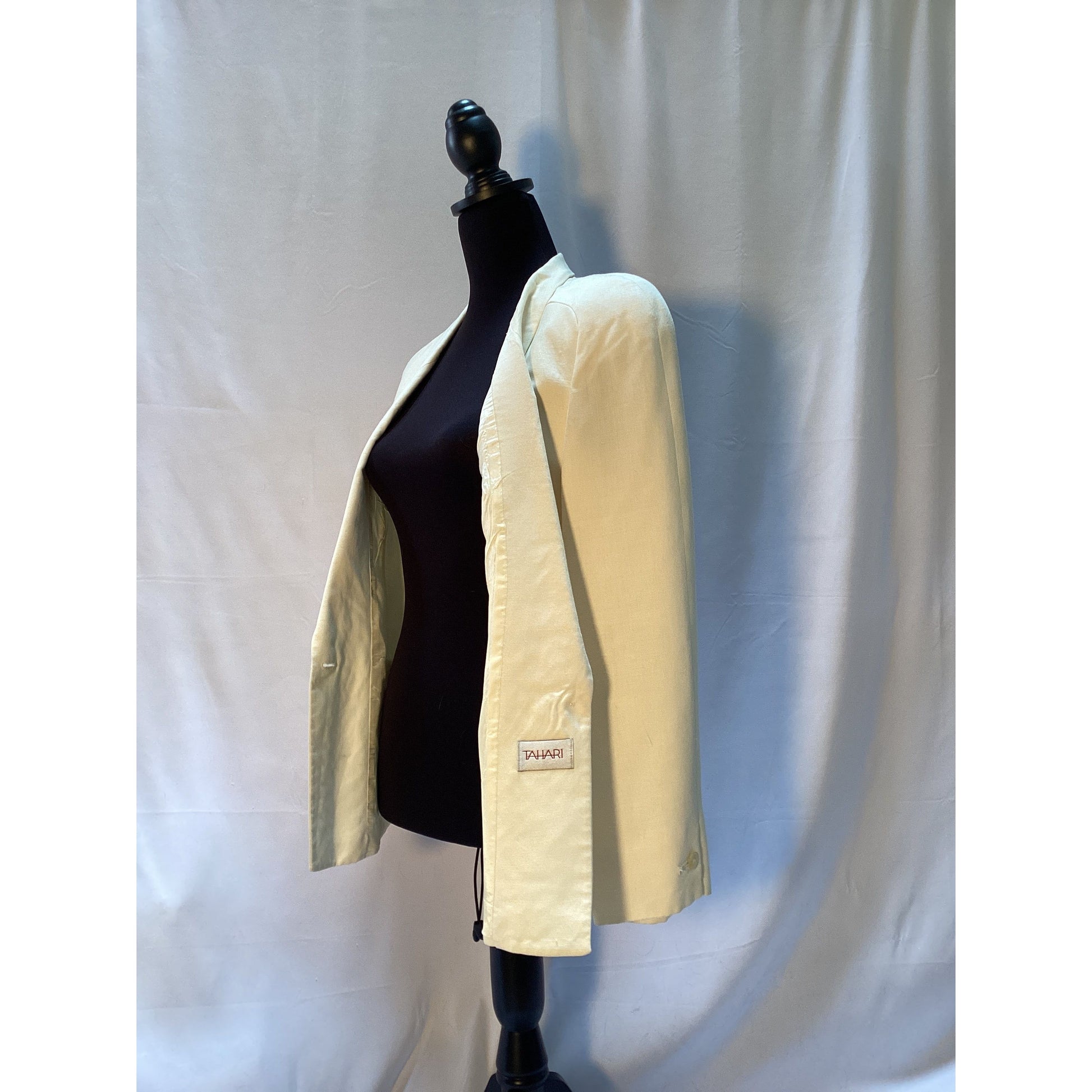 Don't miss out on owning a piece of designer fashion history. Add this Antique White Linen Blazer by Tahari to your collection today. Limited availability. Secure yours now and discover the timeless allure of Tahari's craftsmanship.